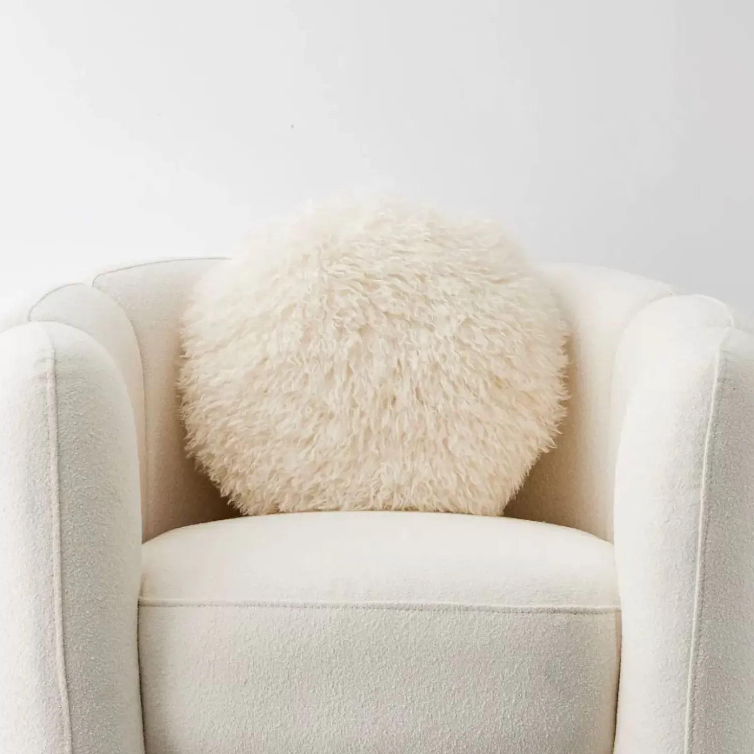 Lean Into Luxury With This Circular, Plush Accent Cushion In Ivory Coloured Faux Fur. The Perfect Statement Accessory For A Bold, Diva-Like Living Room Lounge.