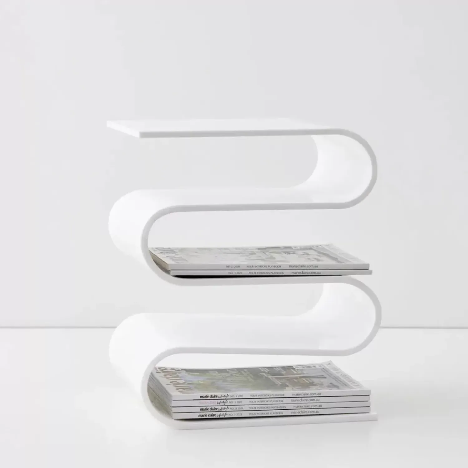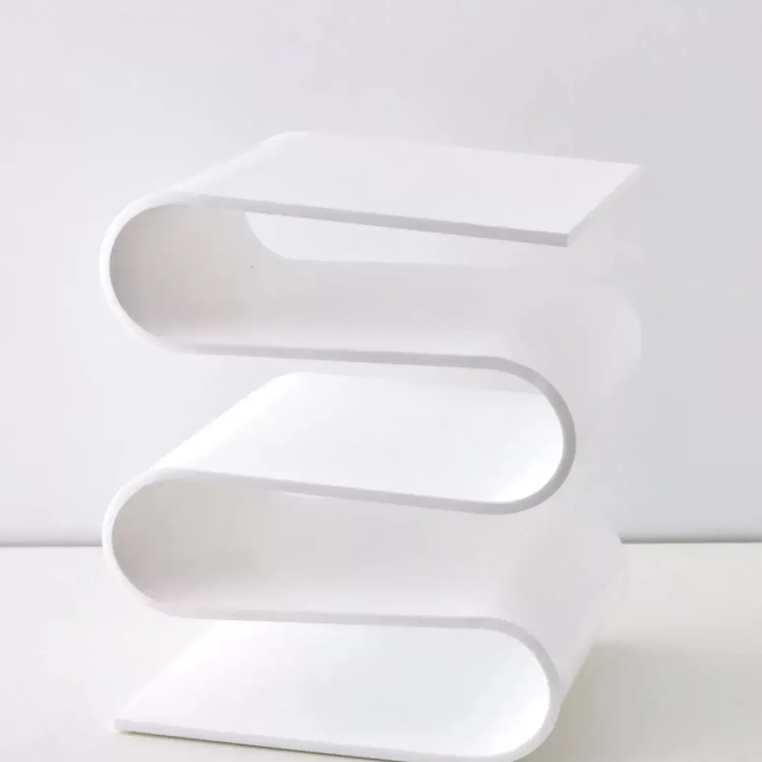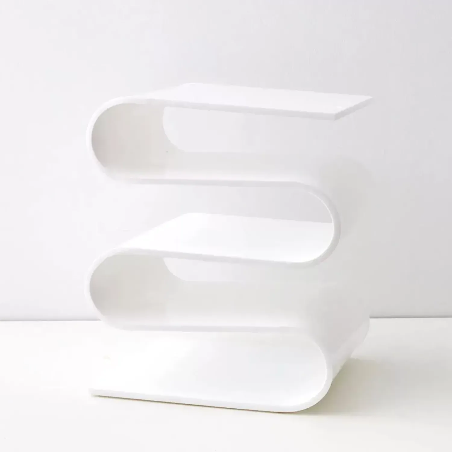 This Mind-Bendingly Clever Design Side Table Is Full Of Storage Options Between It’S Multiple ”S” Bends. The Shiny, Opaque White Acrylic Pops When Paired With Metallic Décor.