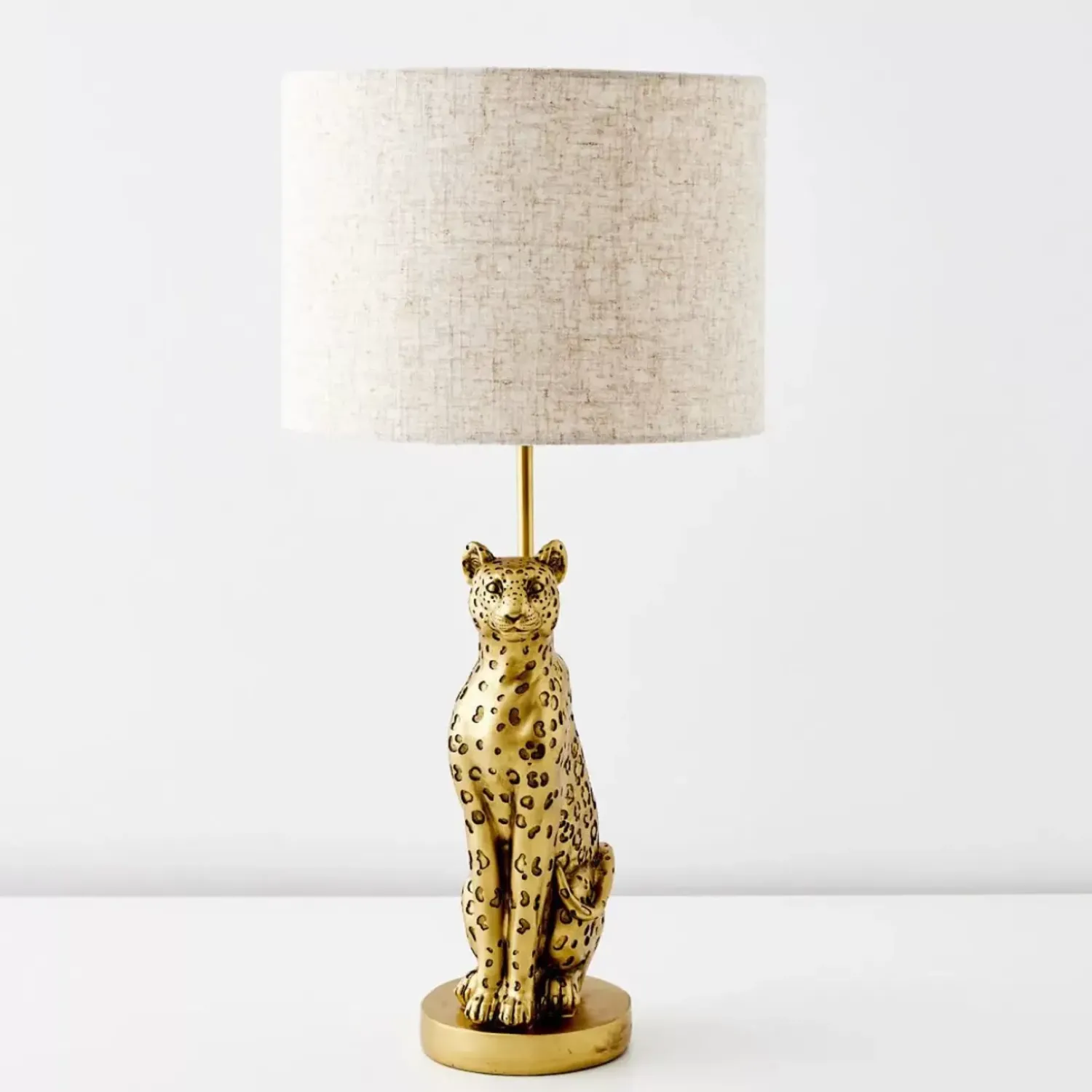 Leap Into Animalia Themed Furnishings With This Scene-Stealing Table Or Desk Lamp With Chic Black And Gold Leopard Shaped Resin Base And Cream Toned Fabric Lampshade.