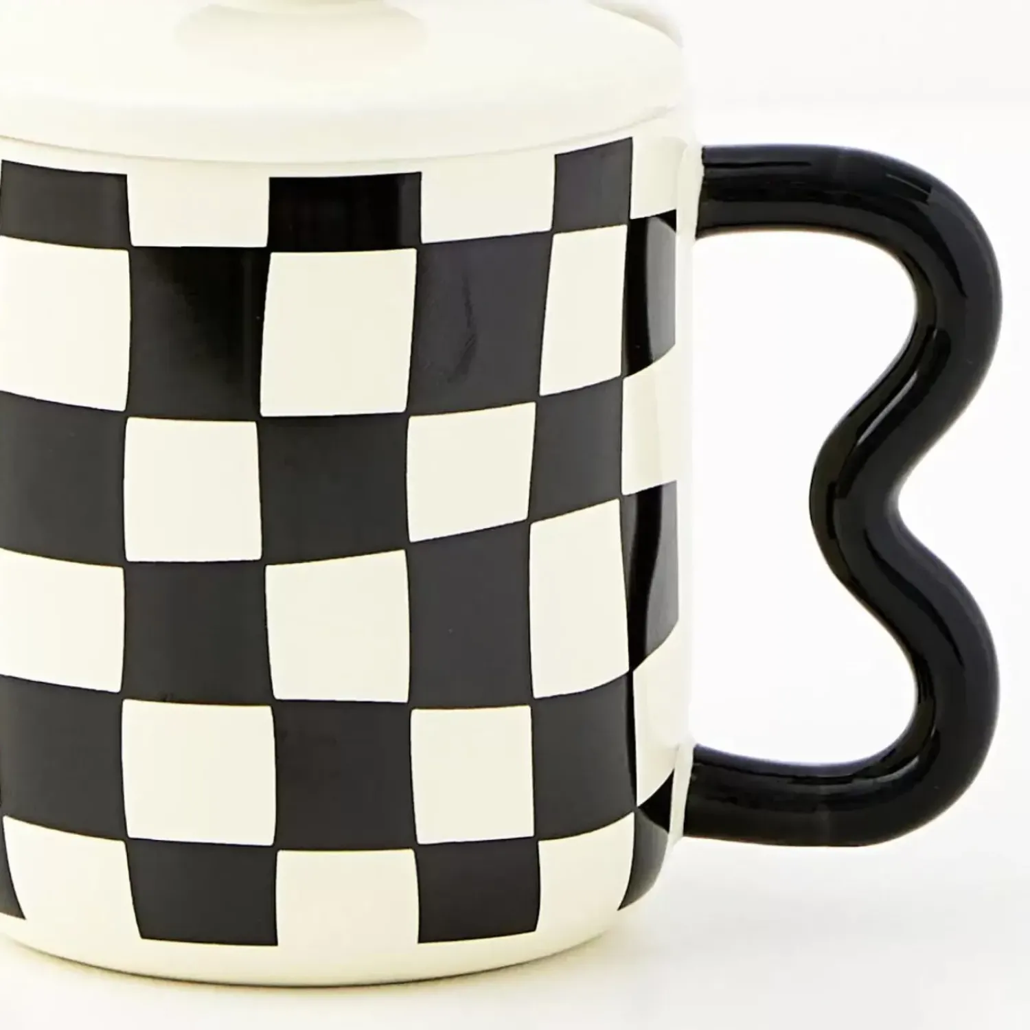 Keep Calm And Coffee On With This Playful Artsy-Crafty Black And Whited Check Ceramic Mug With Matching Ceramic Lid To Keep Your Brew Hotter, For Longer.