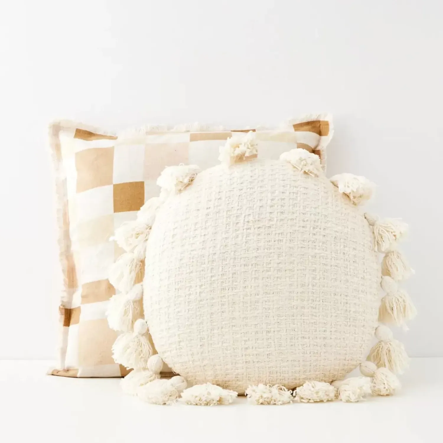This Soft, Circular Accent Cushion Will Have You Smiling Like The Sun. Fun, Round Shape, Cute Tasseled Border, And Easy To Style Cream Colourway Make A Stylish Addition To Lounge Or Beds.