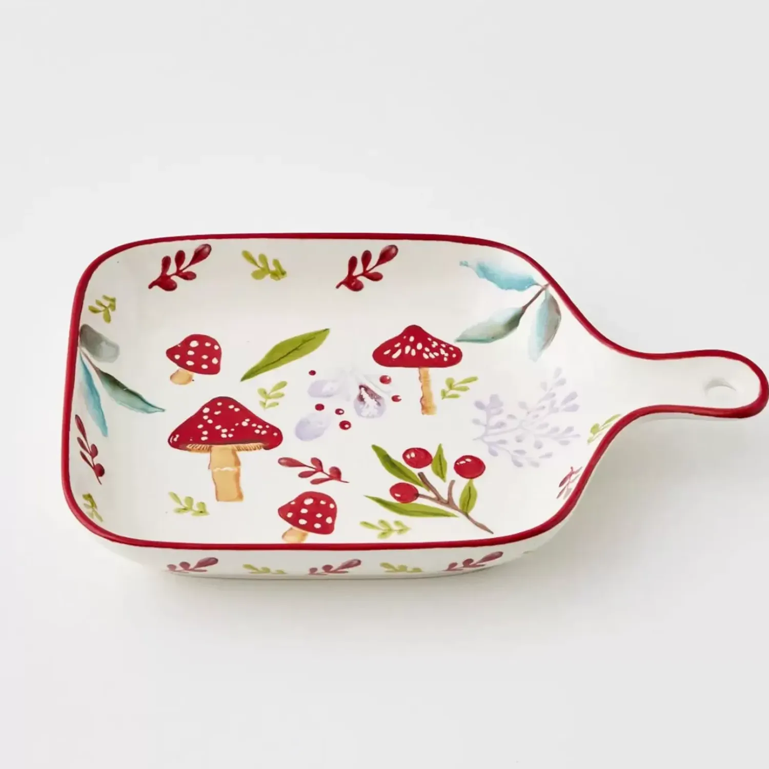 Sweeten Up Afternoon Tea With This Oven-Safe Glazed Ceramic Serving Dish Decorated With Sweet Forest Mushroom Design And Convenient Single Handle For Carrying Or Store Hanging.